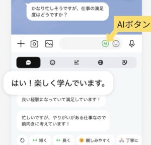 - 返信案の提案:相手の発言を分析して、送るべき返信文を複数候補で提示。トーク画面でAIアイコンをタップし、返信案を選択して送信。
