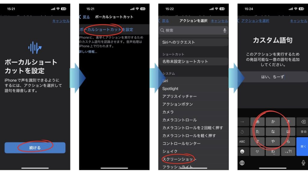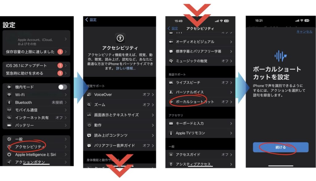 設定アプリを開き、アクセシビリティを選ぶと一覧の中にボーカルショートカットが表示されている。その項目を開くと「ボーカルショートカットを設定」というボタンが現れ、続けるを押すと機能一覧が選べる画面に移る。ここにはショートカットアプリで作成した動作のほか、スクロール、音量調整、スクリーンショット、フラッシュライトなど、すぐに使えるアクションが並んでいる。複数登録できるため、使いたい機能を順番に選んでいく構成になっている。